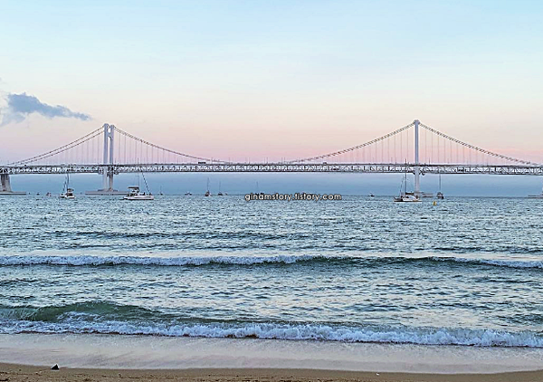눈앞에 보이는 광안대교는 낮에도 웅장했지만 점점 해가 질수록 빛나기 시작했습니다. 해변 곳곳에서 즐기는 사람들의 여유로운 모습이 이곳의 활기를 보여주었습니다.