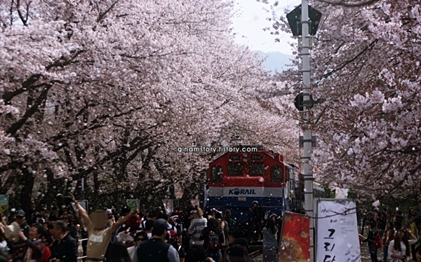 경화역은 기차가 다니지 않아도 그 자리에 머물러 있는 풍경만으로도 충분히 특별한 곳이었습니다. 오래된 철길을 따라 벚꽃나무가 줄지어 있어 걷는 순간마다 꽃잎이 바람에 흩날리는 모습이 참 인상 깊었습니다.