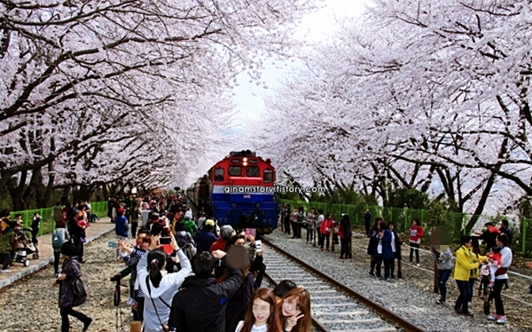 꽃잎 사이로 보이는 옛 기차와 철로는 마치 시간이 멈춘 듯한 느낌을 주었습니다. 주변은 조용하고 평화로워서 사람들 속에서도 나만의 감성을 느낄 수 있었습니다.